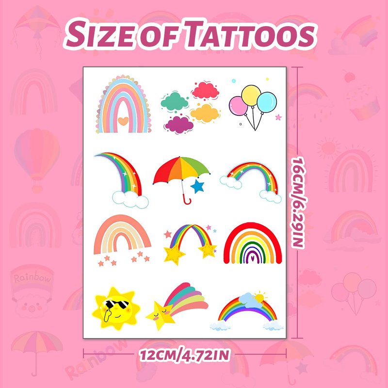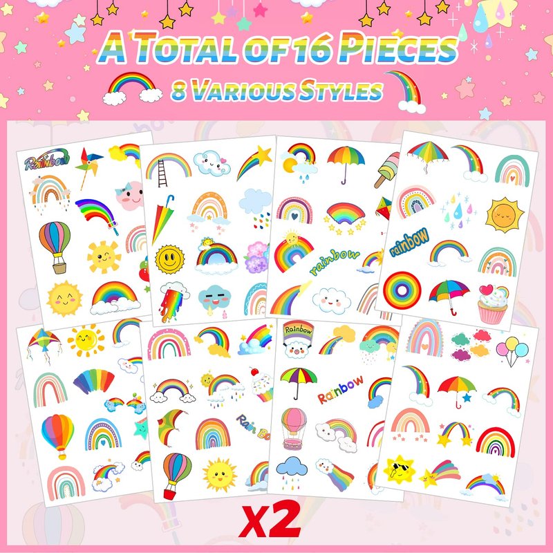- Rainbow Party Supplies: Colorful rainbow temporary tattoo stickers are deeply loved by children, 8 sheets X 2 same patterns of each sheet, a total of 16 sheet and 192pcs patterns! Different kinds patterns can be worn arms, faces, hands anywhere you want a touch of glamour. Add atmosphere to your rainbow party