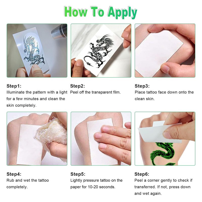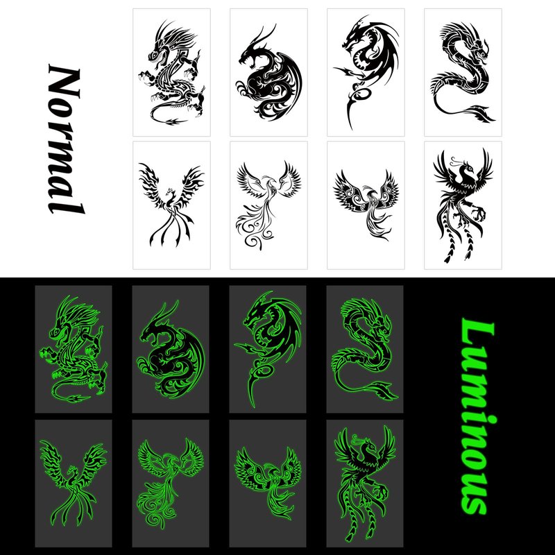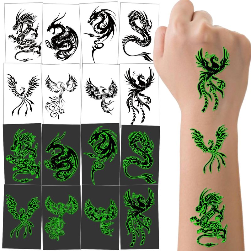 - Glow in the Dark Dragon Tattoos: The glow temporary tattoo stickers adopt a luminous design, it will glow fluorescent color in the dark, perfect for a night party! (NOTE:If you want tattoos to glow in dark quickly, tattoos need to be exposed to strong light .)