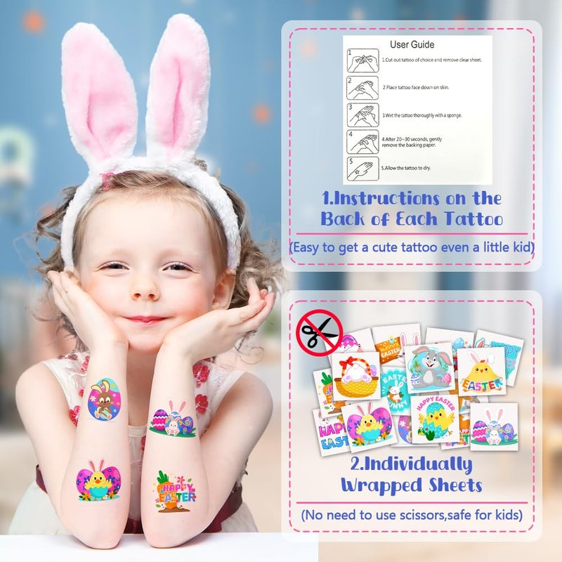 - Safe for Kids-The easter party tattoos are completely non-toxic,kids can safely apply them on their skin and share with each other. Each easter temp tattoos is individual, avoid kids using scissors to cut easter stickers tattoos, and there is the instructions on the back of each fake tattoo, This design greatly reduces safety issue for kids when using it. It is ideal for kids aged 3+