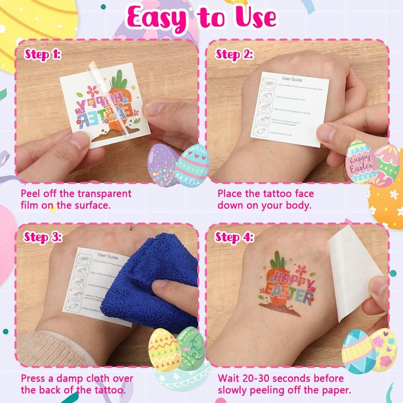 - Easy to Apply & Remove-The Easter Tattoos for Kids make easter egg hunts and egg rolling an awesome surprise for the little ones. Choose the tattoos pattern they like to face it down on skin, wet the temp tattoo with water and wait for 10 seconds, then gently tear off the white surface, the pattern can transfer to skin, kids easter tattoos will be long-last.You can remove it with the baby oil or rubbing alcohol