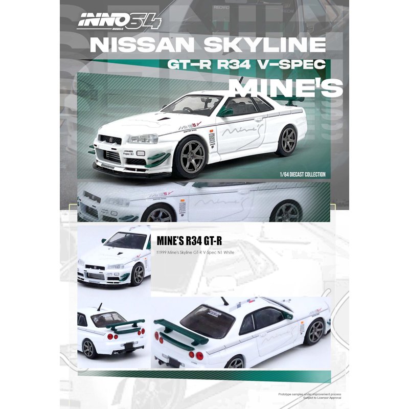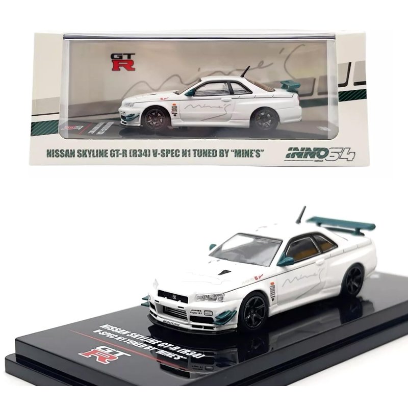 1:64 Scale Diecast Model Car Compatible with Inno64 Nissan Skyline GT-R R34 V-Spec N1 Tuned By MINE'S Limited Edition IN64-R34VS-MINES