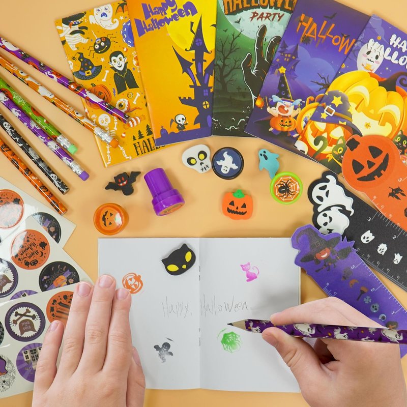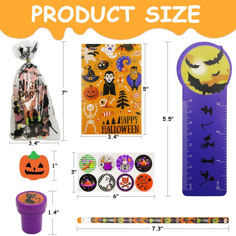 - đăSuper Value Halloween Party Favorsă24 Pack Halloween Stationery Gift Set totaling 168 fun pieces 24 Halloween rulers, 24 Halloween notebooks, 24 Halloween pencils, 24 Halloween erasers, 24 Halloween stamps, 24 Halloween stickers and 24 Halloween goodie bags,ect. Enough quantity meet kids to adding an extra layer of surprise to your festivities.