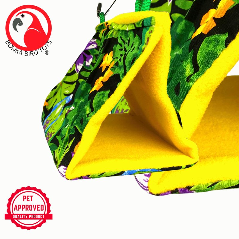 The 1689 Small Bonka Happy Hut from Bonka Bird Toys is a soft and colorful hanging hut for your small sized pet bird. This attractive hanging hut looks wonderful with its jungle print and feels great with its colorful soft fabric. At the top of the bird hut are (2) quick link connectors for fast and easy hanging in the cage. Wrapping around the connectors are (2) soft colorful ropes that stitch into the top of the hut. The outside of the hut has a jungle leaf print with many different sizes and colors of jungle foliage. The inside of the hut has a soft felt like fabric thats super cuddly for pet birds. The bottom of the hut has been reinforced and will hang flat giving your pet a comfy place to sit and relax. The hut also lets you place your pets favorite shredding, fabric and any other kind of material inside. Perfect for adding a safe comfortable hanging perch to any small cage! The 1689 Small Bonka Happy Hut is 100% bird safe¬and weighs and measures approximately: Height:¬(5.75) inches or (5 3/4) inches Width:¬(4.75) inches or (4 3/4) inches Weight:¬Under (3) ounces * Cuddly & colorful bird safe hanging hut. * Great jungle print. * Soft interior fabric. * 100% bird safe.