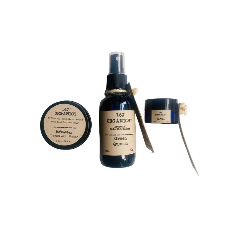Discover the ultimate skincare experience with 16J Organics' signature travel collection, thoughtfully curated to meet your skincare needs while on the move. This exclusive kit includes our top selections - Green Quench Body Oil, Mo'Butter Dry Skin Treatment, and Lip'Rico Lip Balm. Each product in this collection is handcrafted with care, using only all-natural and organic ingredients. The Green Quench Body Oil provides deep hydration for a radiant complexion, the Mo'Butter Dry Skin Treatment targets dry areas with intensive moisture, and the Lip'Rico Lip Balm ensures your lips stay soft and supple. Perfectly sized for convenience, this travel collection ensures that your skin remains nourished, healthy, and glowing, no matter where your journey takes you.
