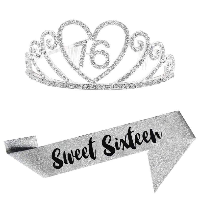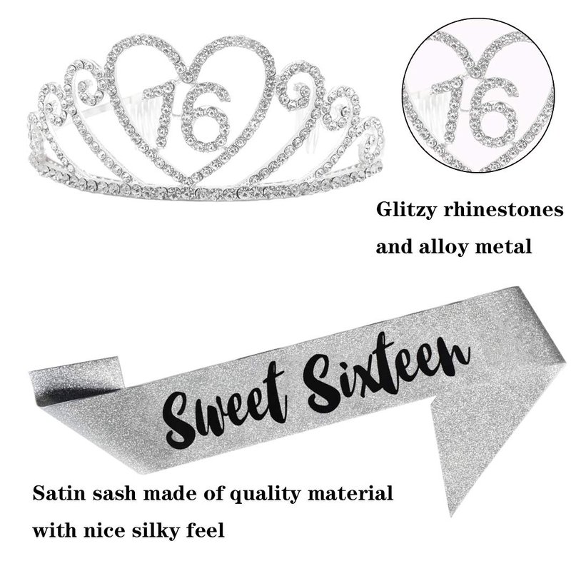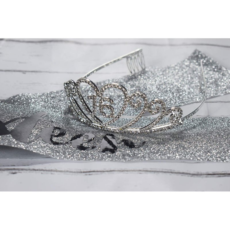 - THE 16th BIRTHDAY KIT INCLUDES - 16th Silver rhinestone crown and Silver glitter " Sweet Sixteen " birthday sash. It is a wonderful set for girl's 16th party and the crown can still be worn for long after the cake is eaten.