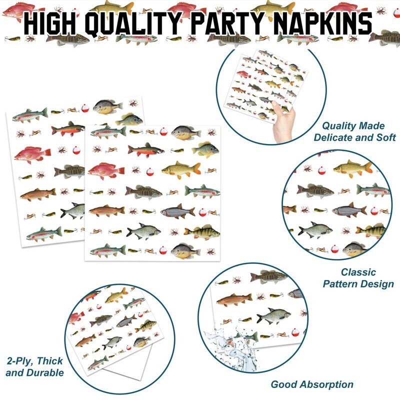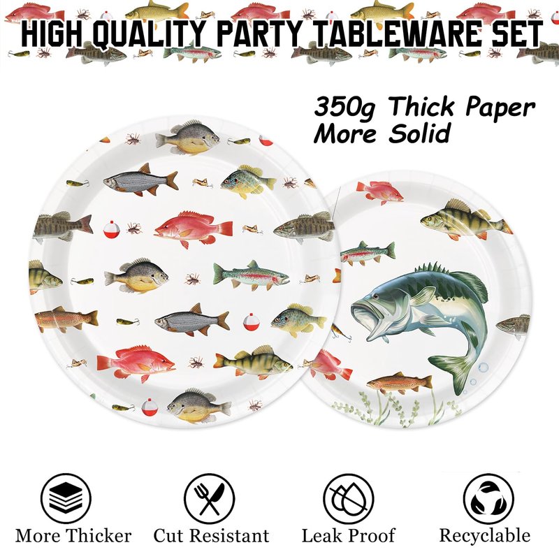 - GONE FISHING DESIGNS: This series of party supplies is designed with a Gone Fishing theme. The paper plates feature boats, fish, fishing lines, bait, trees, river water, and other designs in harmonious colors, creating a great fishing birthday party decorations atmosphere for you.