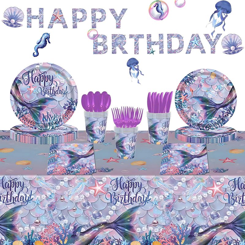 - 【Mermaid Party Decorations】: Our mermaid theme party decorations set specifically includes 1×birthday banner, 1×mermaid tablecloth (54×108 inches), 24×napkins, 24×cups, 24×forks, 24×knives, 24×spoons, 24×7-inch plates, 24×9-inch plates.
