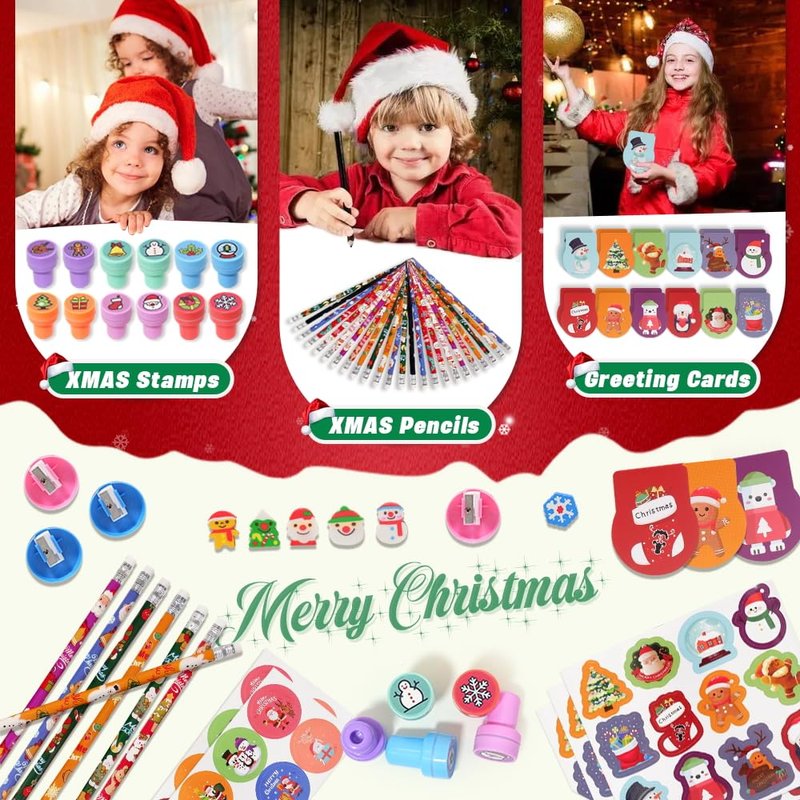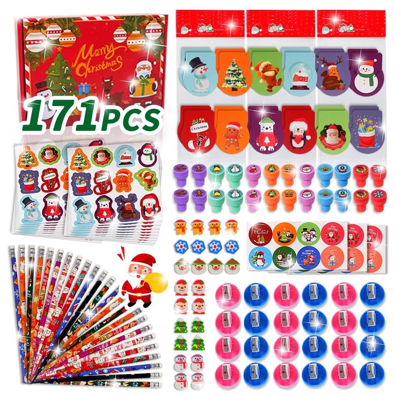 171 Pieces Christmas Stationery Party Favors Bulk Xmas Goodie Bag Stuffers for Kids Stationery Set School Class Reward Prizes Notebooks Pencils Sharpener Erasers Stickers Stamps for Classroom Gift