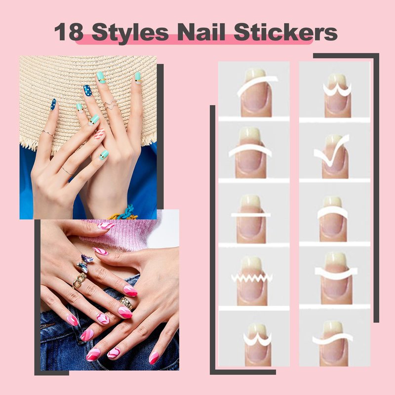 18 Designs French Manicure Nail Art Stickers, Self-Adhesive Nail Tips Guides for DIY Decoration Stencil Tools (18 Sheets)