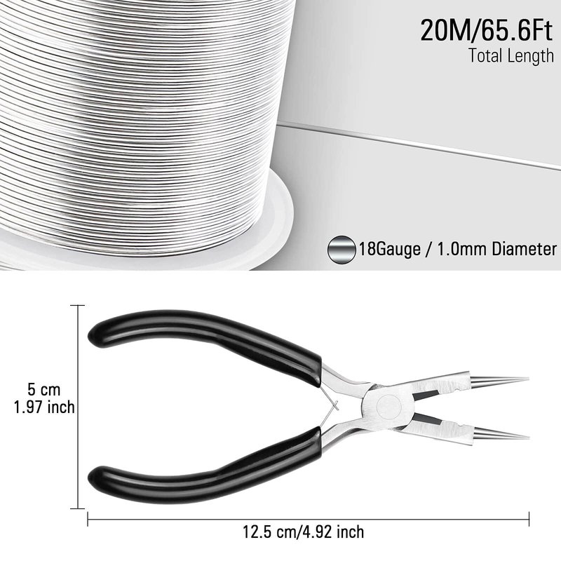 - 【Package Includes】The jewelry wire for jewelry making kit contains an 18 gauge / 1 mm copper wire ( 20m / 65.6ft total length ) and a pair of pliers. PLEASE NOTE: The cutter plier is coated with oil to prevent rust, which may make it look dirty. Please press and hold the wires when you untie the wires. If they fall apart, then you may need to rewind the wires back to the spool.