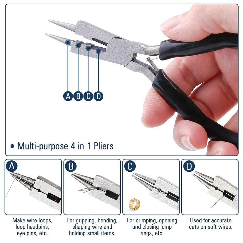 - 【Multi-purpose 4 in 1 Pliers】Rounded needle-nose of the pliers can be used to make wire loops, wire wrapping, loop headpins & eye pins. The shaping hole is perfect for gripping, bending, shaping wire, and holding small items. The flattener can be used to crimp, open and close jump rings shape wire. The cutter can be used for accurate cuts on soft wires.