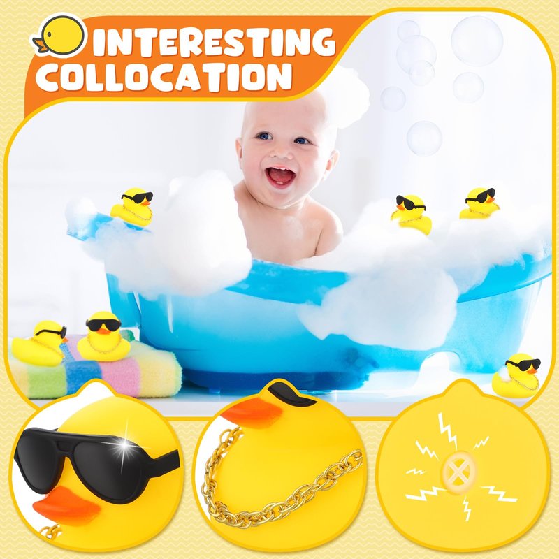 - Bath Happily: with cute and vibrant duck appearance and matched sunglasses and necklaces, the little rubber ducks are cool, they can float on the water; When you press on them, they will make interesting sound, add fun to bathing, so they are ideal for baby bathing or baby playing in tubs and swimming pools