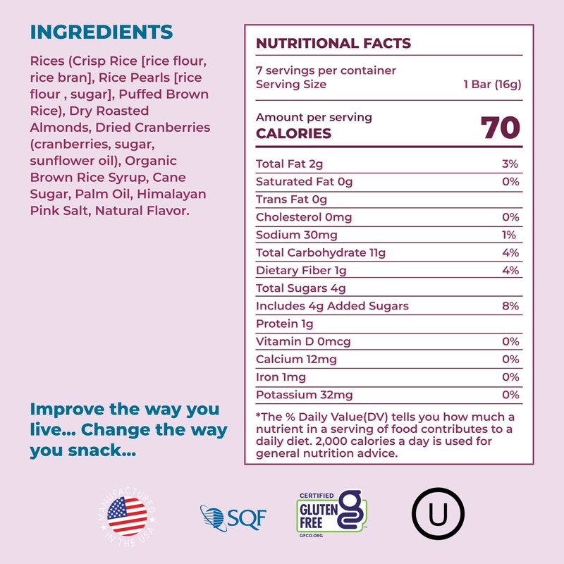 - ALMOND, CRANBERRY & HIMALAYAN SALT: Life is complicated, but snacks don't have to be. Enjoy these simple, low cal snacks with puffed rice, crunchy baked almonds and sweet dried cranberries. The tastiest way to curb your appetite & control your weight
