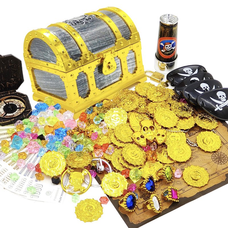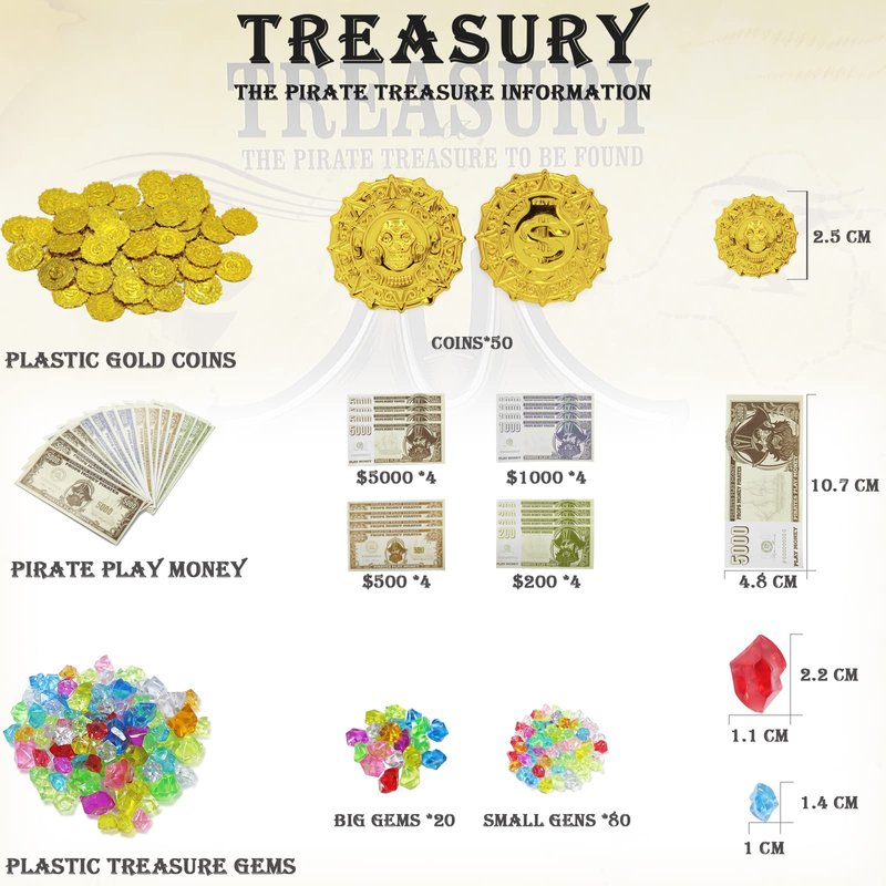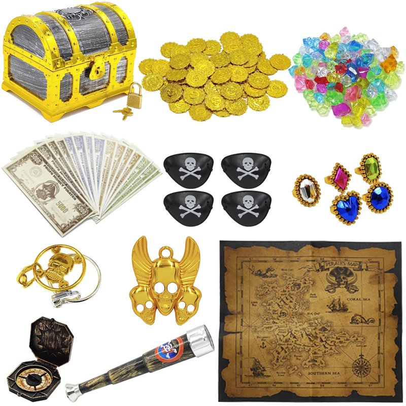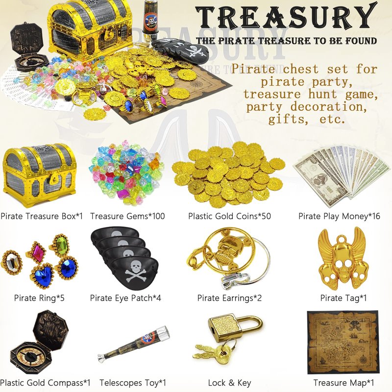 - 🎁【Funny Pirate Treasure Hunt Kit】: Pirate treasure box included 1x golden frame pirate chest with lock, 100x imitation pirate treasure gems, 50x plastic gold coins, 16x pirate play money, 2x ring toys for ears, 5x plastic rings toy, 1x pirate necklace, 1x treasure map, 1x plastic vintage compass, 4x black pirate eye patch, 1x pirate telescope toy
