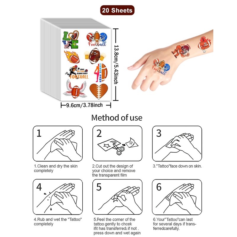 - Easy to Use Football temporary tattoos, Cut out the desired motif,remove the plastic covering film of Football temporary tattoo,then stick the tattoo face down on the clean and tidy skin,wet the tattoo with water,gently pat and press for about 30 seconds,then tear off the paper