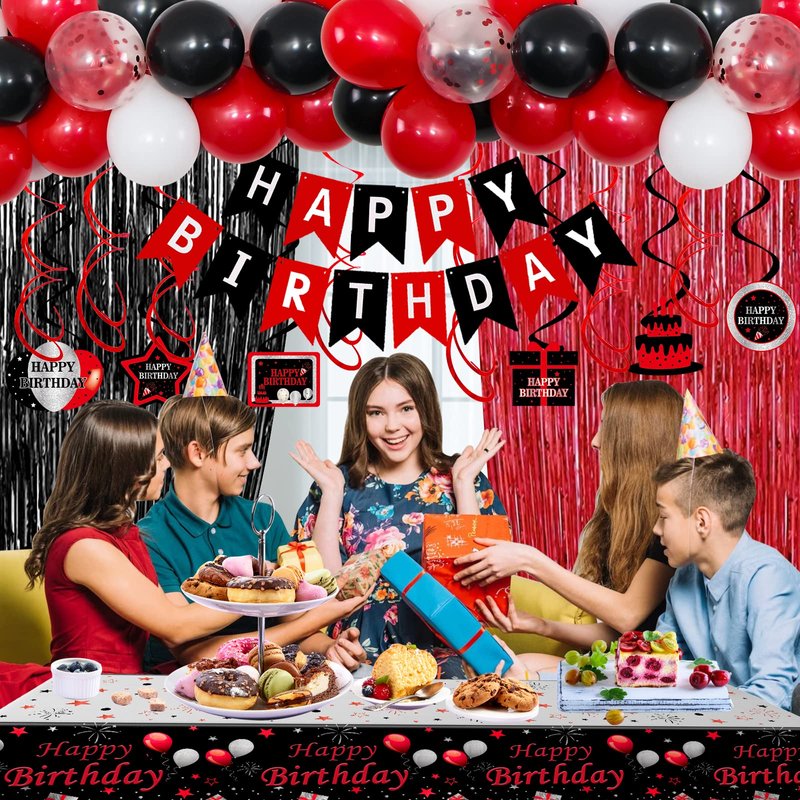 - 🎈Red and Black 18th Birthday Decorations for Boys Girls: Red and black theme birthday party decorations contains everything you need to prepare a impressive and gorgerous birthday party. Shiny foil fringe curtain and colorful decorations will be a great addition to birthday theme party, amazing to boost the atmosphere for your party over.