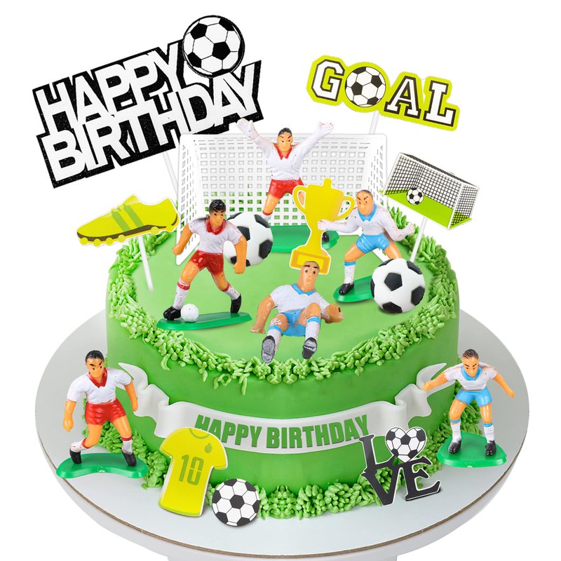 - Quantity:You will receive 1 set of resin soccer players(6 in total); 2 3D soccer ball cake toppers; 2 goals; 9pcs soccer theme happy birthday cake toppers.