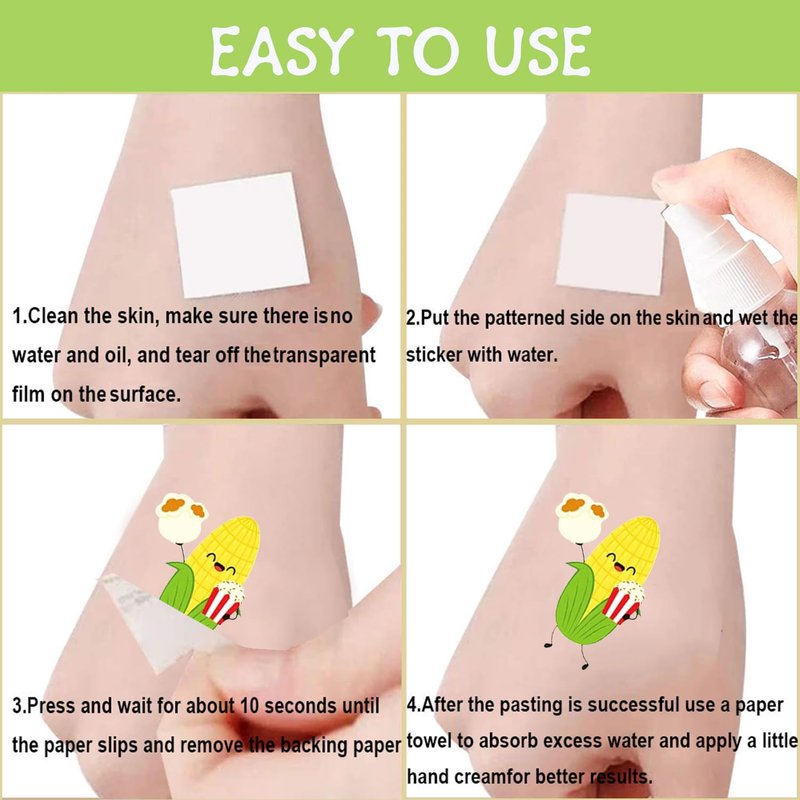 - How to Use: Cut each tattoo out of sheets and remove the sheet clearly. You can stick it on hands, face, arms or wherever you feel safe. Moreover, you put corn tattoo down on glasses, clothes, and a smooth flat. After that, you wet it thoroughly with water and wait for 20-30 seconds, you get rid of the backing paper