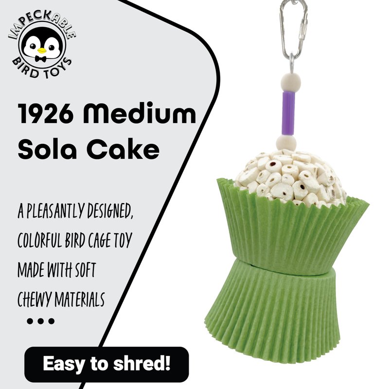 Introducing the 1926 Medium Sola Cake from Impeckable Bird Toys is an engaging bird toy handcrafted to provide hours of entertainment and enrichment for your feathered friend. Like its smaller counterpart, the 1925 Small Sola Cake, this medium-sized version is made from soft, natural sola wood, offering birds a satisfying texture to chew and shred. The core of the toy is surrounded by colorful cupcake liners, creating a visually appealing design that also adds an extra layer of fun as birds work to tear them apart. This toy is lightweight and easy to install in your bird’s cage using its secure metal clip, making it ideal for small to medium-sized birds who enjoy foraging and chewing activities. The sola wood and paper liners are completely bird-safe, allowing your pet to play without worry. This toy not only promotes mental stimulation but also encourages natural beak maintenance as birds chew and peck at the soft wood. Handcrafted in Florida, USA, the 1926 Medium Sola Cake is designed with care to ensure the safety and well-being of your pet. It’s perfect for providing essential physical and mental exercise while keeping birds entertained. ### Key Features: - Handcrafted from soft, chewable sola wood - Colorful cupcake liners for extra shredding fun - Promotes foraging and chewing instincts - Lightweight design with easy-to-attach clip - Ideal for small to medium-sized birds ### Specifications: - Height: 7 inches (17.8 cm) - Width: 4 inches (10.2 cm) - Weight: Under 3 ounces - Handcrafted in Florida, USA