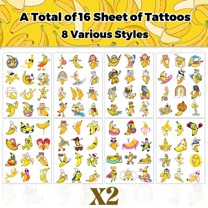 1 pack of 16 sheets of cartoon banana temporary tattoos featuring 8 unique designs. Each tattoo sticker offers a fun and playful design to brighten your day. <br><br>