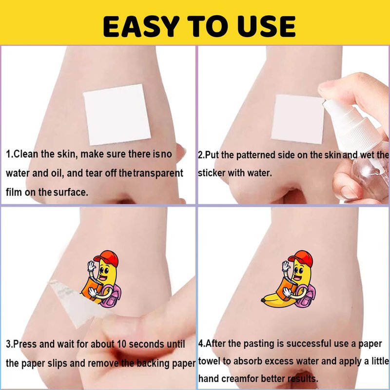 - Easy Application: Simple to apply and just cut out your favorite design, place it on a clean, flat surface like hands, arms, or clothing, and moisten with water for 30 seconds. Remove the backing paper to reveal your tattoo
