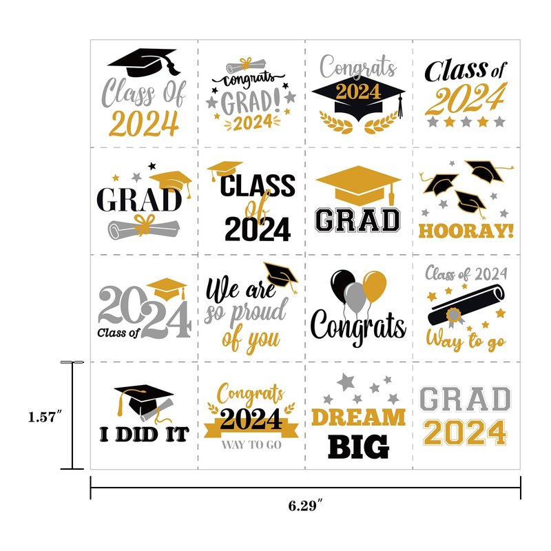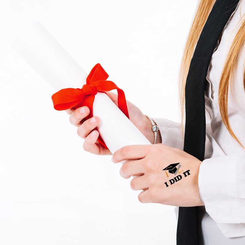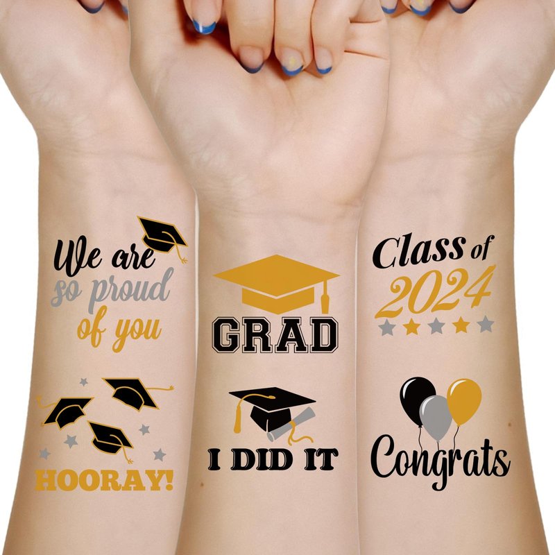 - Package of 192 graduation themed temporary tattoos with 16 designs.