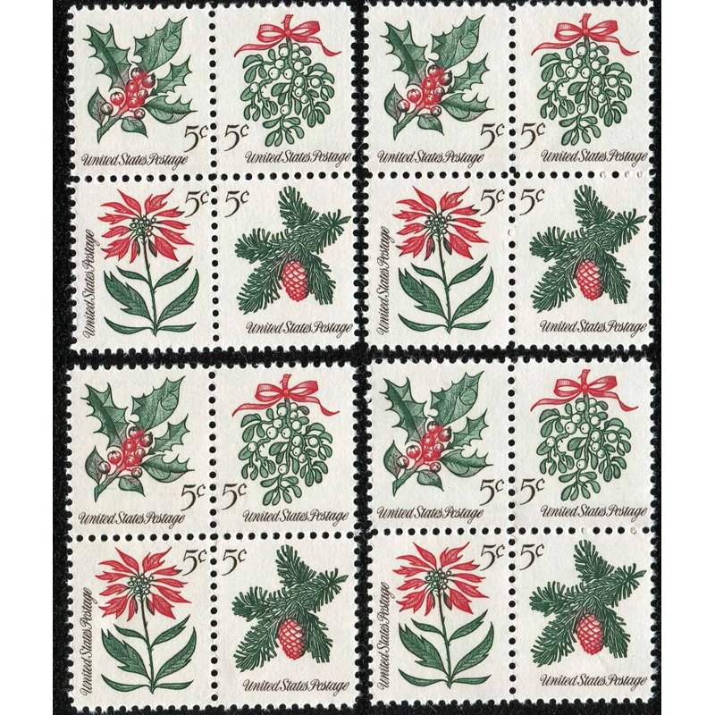 1964 VINTAGE CHRISTMAS HOLIDAY FOLIAGE ~ MISTLETOE ~ EVERGREENS ~ POINSETTIA ~ HOLLY ~ 16 NEW POSTAGE STAMPS (#1257 Lot of Four Blocks of 5¢ Stamps Total 16 Stamps) Ready to use on your Christmas