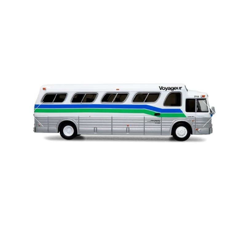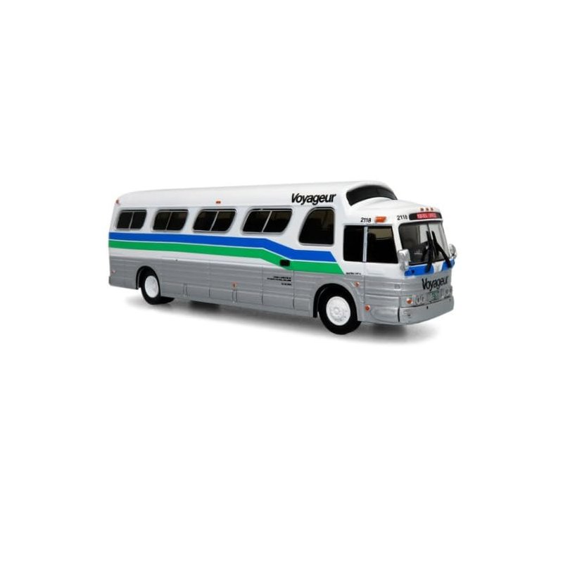 Brand new 1/87 (HO) scale diecast model of 1966 GM PD4107 "Buffalo" Coach Bus "Voyageur Colonial" Destination: "Montreal Express" (Quebec, Canada) "Vintage Bus & Motorcoach Collection" die cast model by Iconic Replicas 87-0287