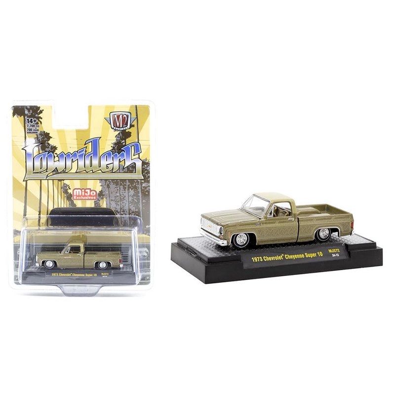 1973 Chevy Cheyenne Super 10 Pickup Truck Gold Metallic with Graphics Lowriders Limited Edition to 7700 Pieces Worldwide 1/64 Diecast Model Car by M2 31500-MJS72