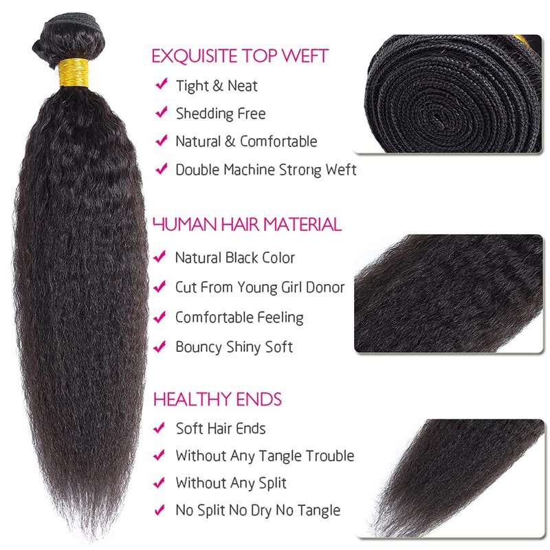 - Yaki Straight Bundles Hair Quality:Straighe Human Bundles Hair,Double Strong Weft,Tight And Neat Weft,Thick And Healthy End, No Tangles,Soft And Full,Smooth And Silky Human Hair Bundles.