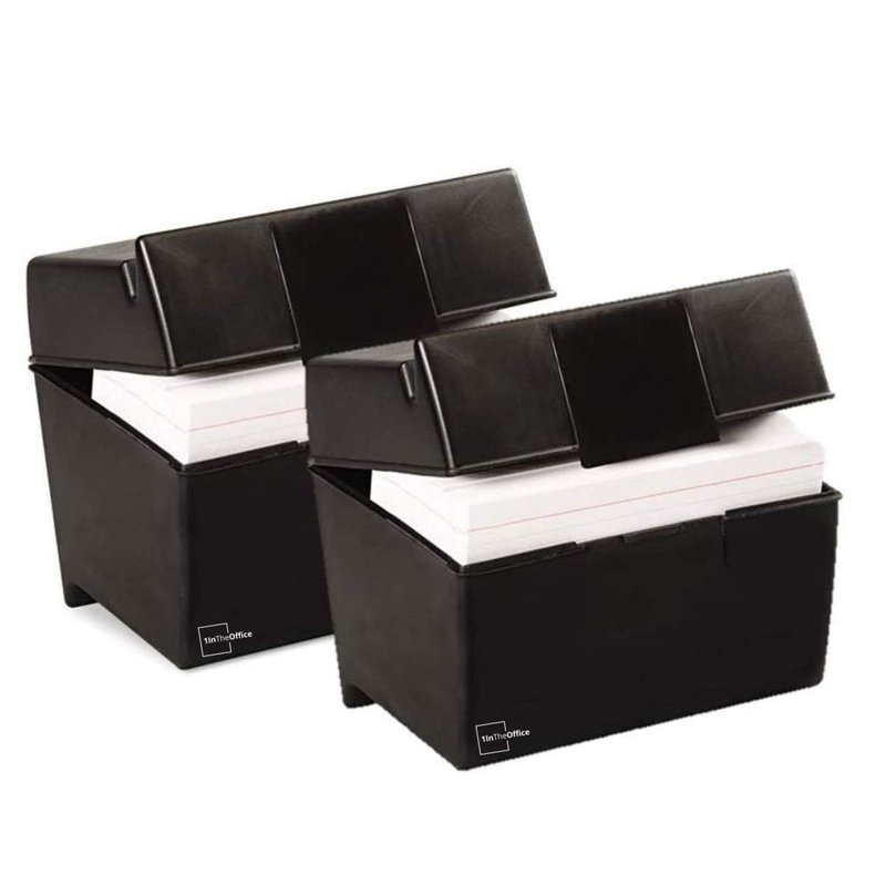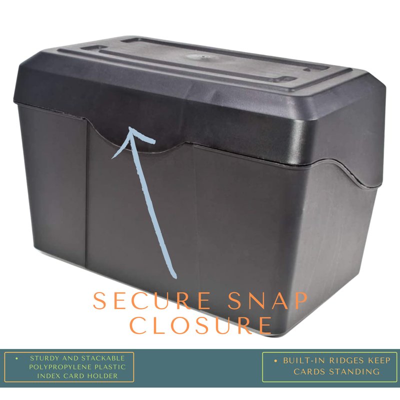 Our 1InTheOffice Index card case holds up to 400,5 x 8 inch index cards. The card case comes with stepped floor design for easy access. Also features a Secure snap closure. The stackable design is ideal for office, school or home use.Or recipe box, Convenient size makes this card box easy to display on an office desk, slide into a drawer, or toss into a backpack. This index card holder is a back to school staple school supply for students and teachers alike. Our box is constructed of extra durable black plastic.