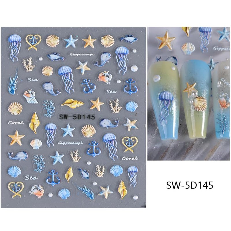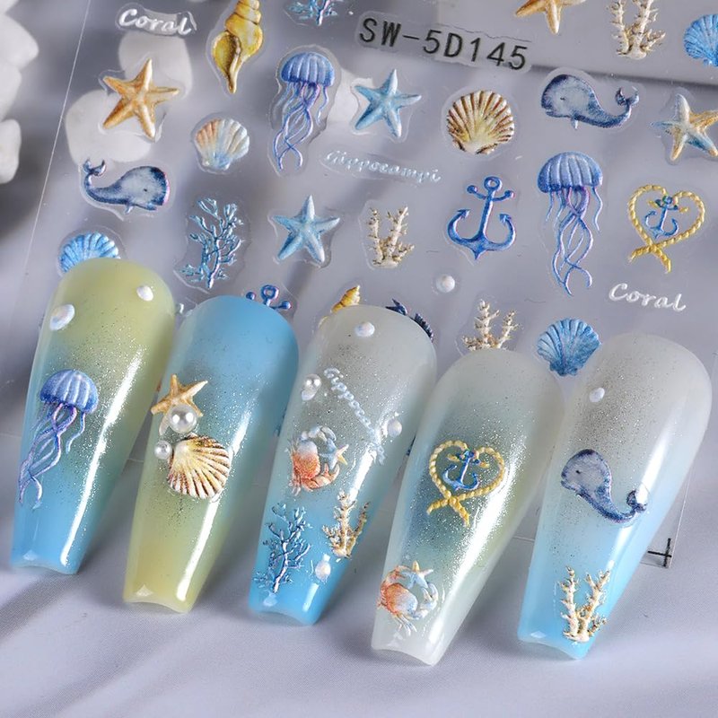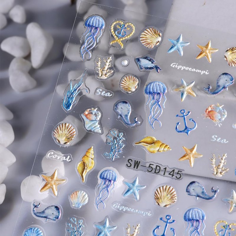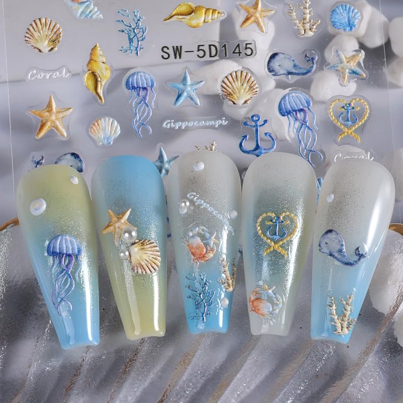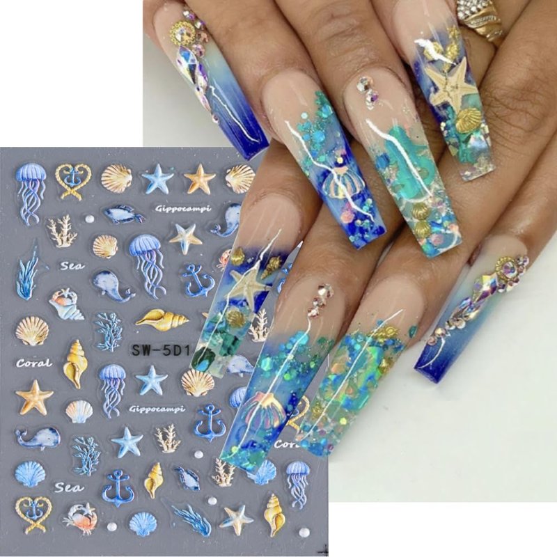 1PCS Summer Nail Art Stickers 5D Embossed Seashell Nail Stickers Cute Nail Decals Marine Ocean Starfish Nail Art Design Decals for Nail Art Summer Designs Self Adhesive Nail Art Supplies Accessories
