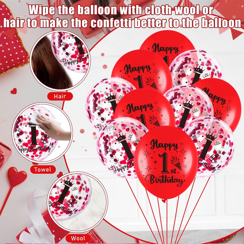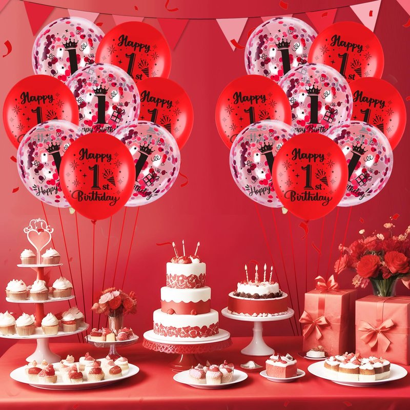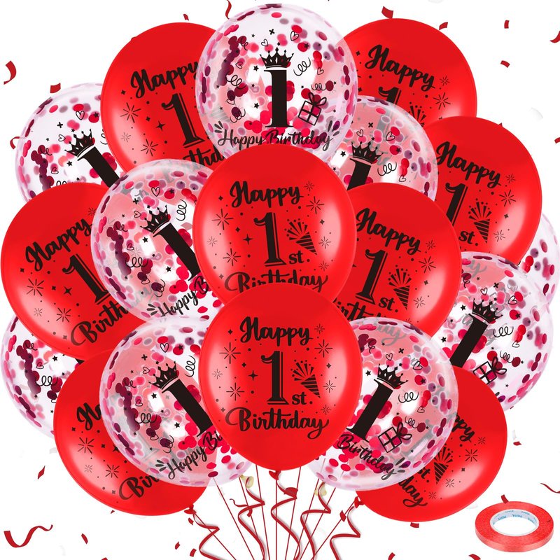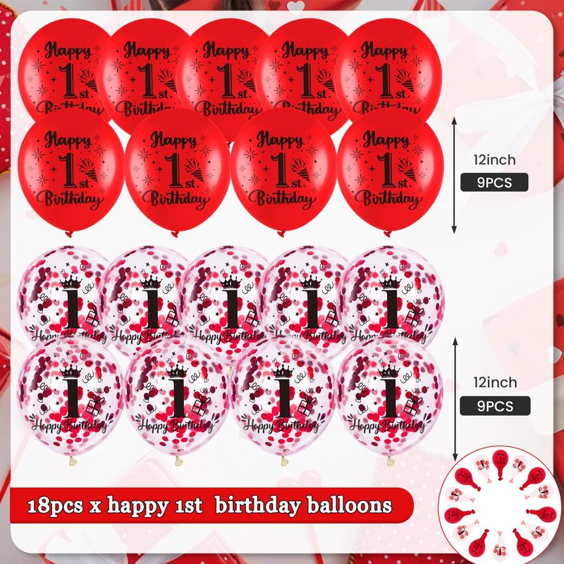- What You Get:These are such cute, red 1st birthday balloons. The package comes with 9 pcs red 1st birthday latex balloons, 9 pcs 1st confetti balloons, and 1 pc ribbon. A very nice mixture set that compliments each color