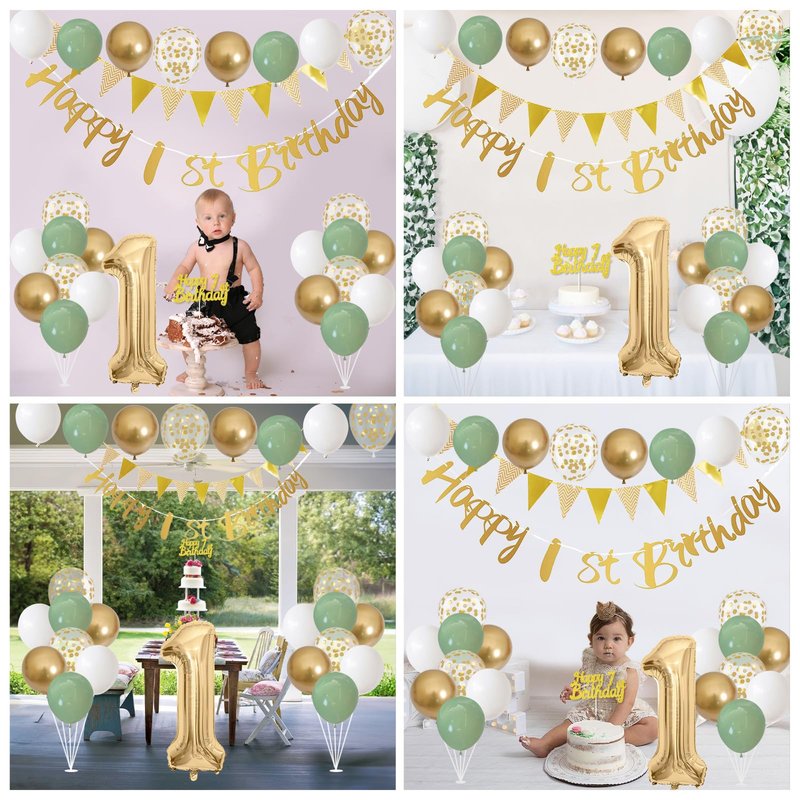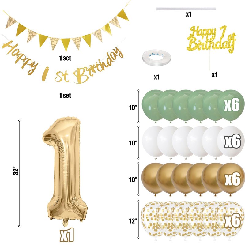 - π Sage Green 1st Birthday Decorations - You will get 1pc gold 1st birthday banners, 1pc gold triangle flag bunting banner, 1pc first birthday cake decorations, 1pc 32inch number 1 foil balloon, 6pcs 10inch sage green birthday balloons, 6pcs 10inch white party balloons, 6pcs 10inch metallic gold latex balloons, 6pcs 12inch gold confetti helium balloons, 1pc white ribbon.