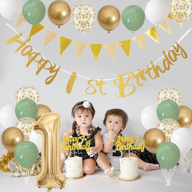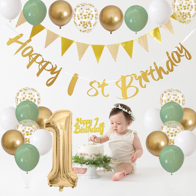 - π Value Baby Girl First Birthday Party Decor Set - The Green White Gold birthday party decorations contains everything you want on the baby 1st birthday party. Whether it's a one year anniversary or a 1st birthday party, our 1st birthday party supplies will create a festive atmosphere and make the birthday men or women feel special and the one birthday bunting banners set is not only great for photo booth backdrop, but also good for other memories occasions.