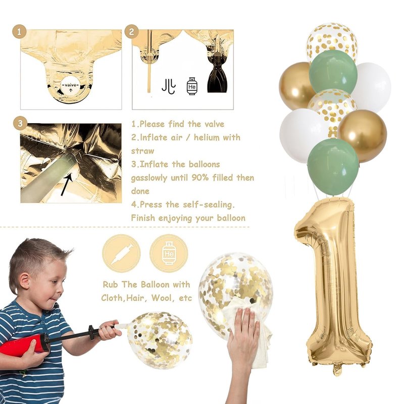 - π EASY TO USE - Sage green one year old birthday balloons can be blown up with air or helium! The foil balloons have self-sealing valve does not need to be knotted. And The happy 1st birthday banner bunting comes with ribbon, very easy to assemble and hang. You can easily prepare a surprise and unforgettable birthday party and cheers to 1 year.