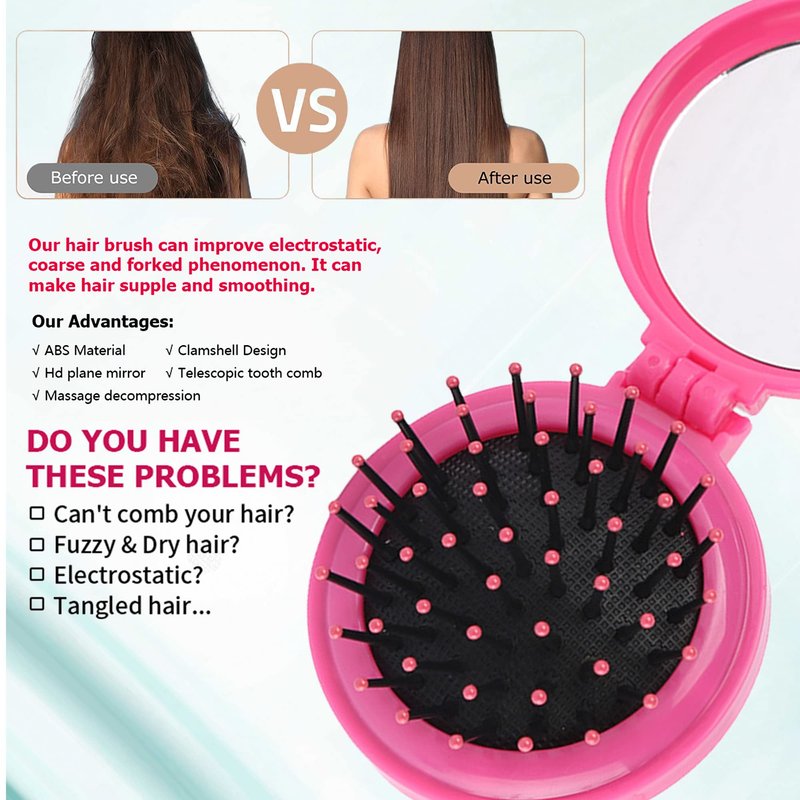 1 New Folding Hair Brush With Mirror Compact Pocket Size For Travel Car Purse Bag Handbag Blue Or Pink Random Color Will Sent !