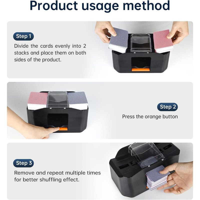 - 【 Equipped with High-Speed Silent Motor 】 The automatic shuffling machine can handle 1-2 decks at a time. After inserting the cards into the openings on both sides of the product, they will be automatically shuffled with a single push of the button and wait about 2 seconds. To better disrupt the order of the cards, it is recommended to shuffle more than 2 times.