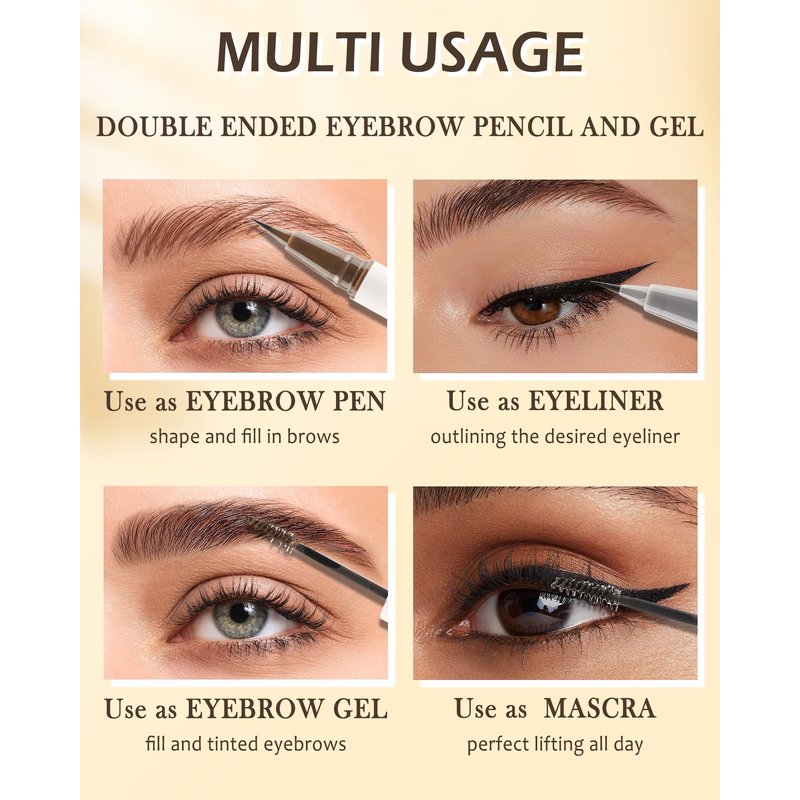 - MULTI-USE EYEBROW PRODUCT - This hypoallergenic brow pen and gel is a multi-use product. Precision felt tip micro brow pen side not only can fill the gap of eyebrow, but also can use as an eyeliner pen, outlining the desired eyeliner. And the tinted brow gel can also use as a eyelash defining mascara, giving you a natural curling eyelashes look.