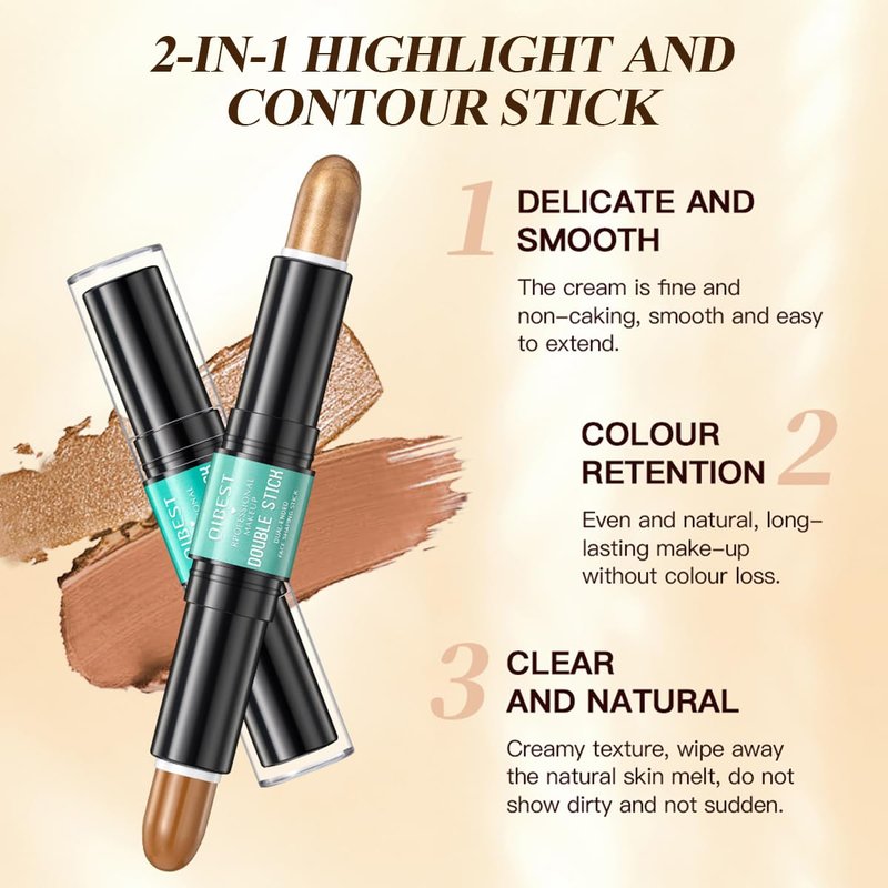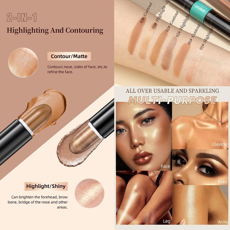 - 2-in-1 Highlight and Contour Stick Set:Double-headed contour highlight stick has a silky, lightweight,buttery smooth formula that blends seamlessly onto your skin!The Highlights and makeup contouring sticks create the illusion of a sculpted, defined face in no time
