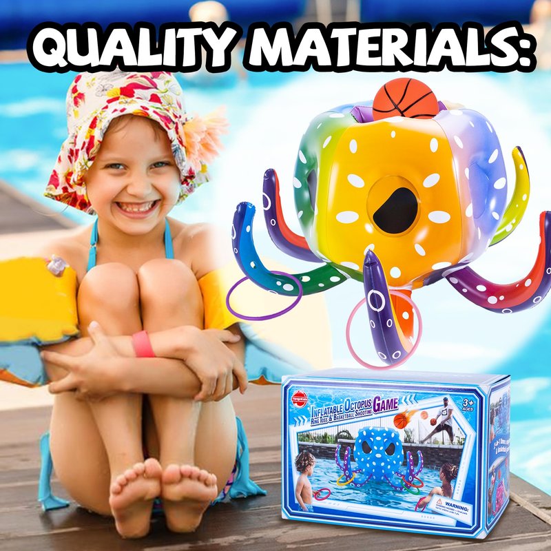- 【Fun Summer Toy Pool Game】Octopus pool floating toy set includes--cool inflatable big octopus*1, colorful plastic ring*6, inflatable basketball*2 and free pump*2, exquisite gift box*1.The great-value summer water toys pool basketball game combo set adds more fun and laughter to your summer pool activities. This summer, experience extraordinary pool fun with us.