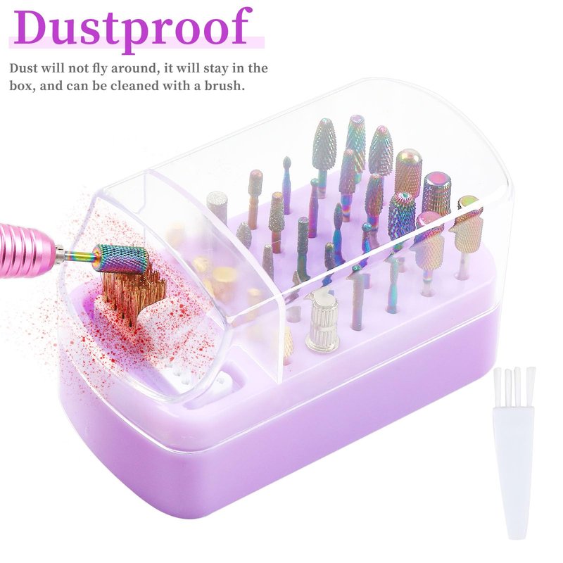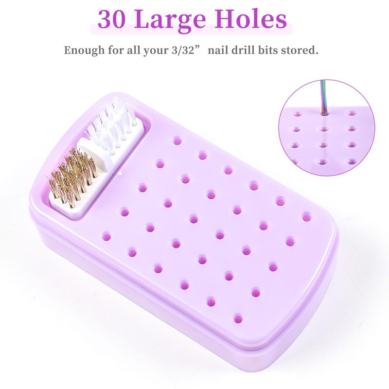 2 in 1 Nail Drill Bits Holder & Nail Drill Bits Cleaning Brush Case 30 Holes (Purple)
