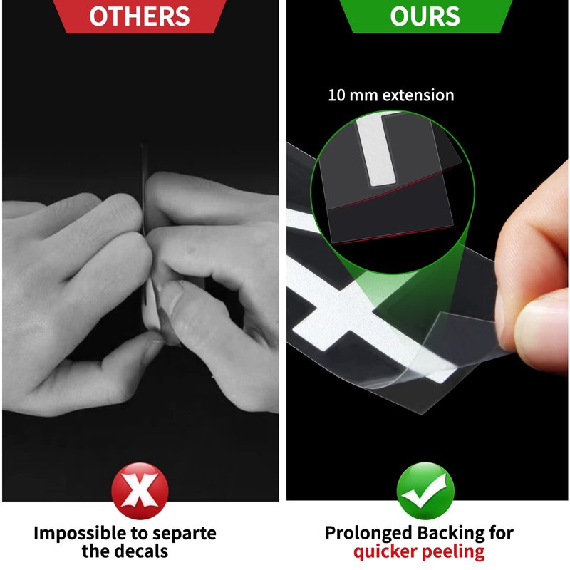 - Prolonged backing, less installation time: The backing of the mailbox numbers are prolonged by 100 mm. You only need to pinch the extended end to separate and remove the back, then apply the numbers on the mailbox in seconds. This method can completely solve the problems of uneasy installation or separation that commonly occur with similar vinyl numbers in the market.