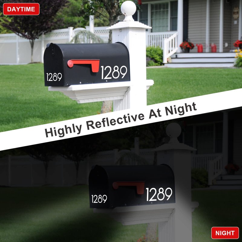 - Reflective and visible at night: Add these number stickers to your mailbox or house to guide your guests and delivers by illustrating your address number. These reflective mailbox numbers are easy to read and spot even at night as they will glow when the light hits them. Please note that pure white is not reflective, only silver white will be reflective as it added vinyl material. Our mailbox number stickers are made in premium reflective vinyl material, so the color is silver white.