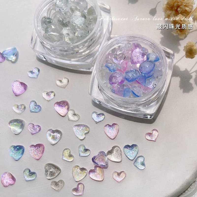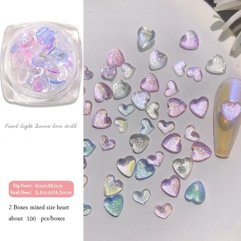 Package: Included:2 Box Heart-Shaped Nail Jewelry of clear white and mixed color