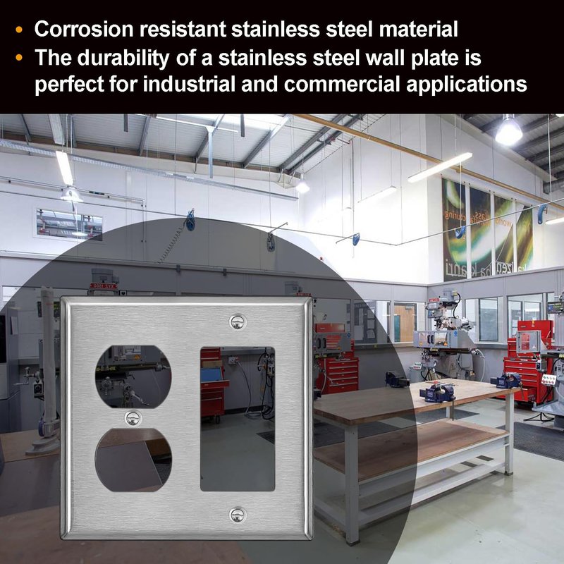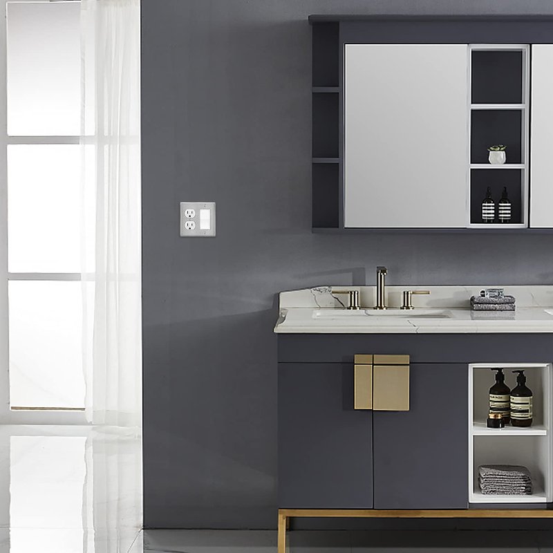 - Features: Smooth brushed finish with round curved edges, easy to clean and resist dust accumulation. Specifications: H4.53” x W4.57” x D0.25”, 2-gang standard size, single decor and single duplex, silver, matching screws included