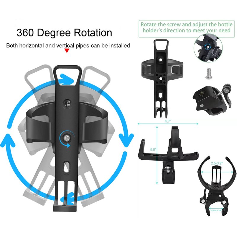 - ADJUSTABLE - Adjustable 360 degree swivel, turn the screw to make sure it fits your pipe size, easily choose the orientation of the bottle holder according to your needs, making it more convenient for you to use, this bicycle cup holder can be installed on the bicycle handlebar, under the seat , down tube, front fork, front tube. Clamp range 0.75-1.7 inches.
