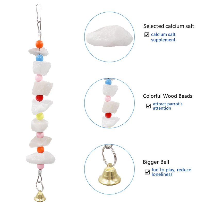 - Health-Promoting Chew Toys: These bird beak chewing stone toys are crafted from natural salt blocks with an irregular outer surface. As your parrot chews, beneficial mineral powder falls off, supplementing essential nutrients and promoting overall pet health. These toys are safe and natural, ensuring worry-free playtime.