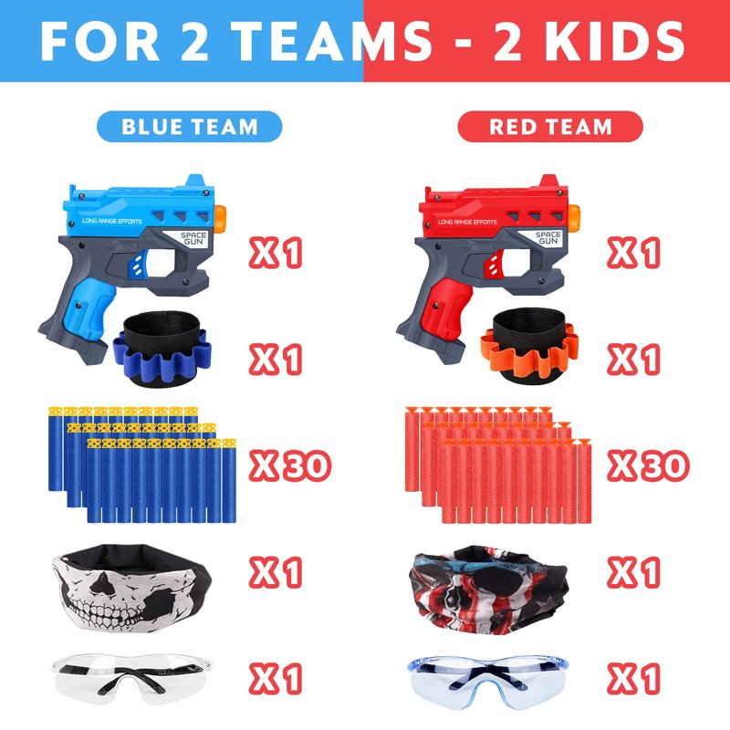 - 🔫Package List-This toy gun sets for 3-5 5-7 comes with 2 explosive energy guns (red/blue), 40 super soft foam bullets, 2 goggles, 2 face masks and 2 wrist straps. Children can enjoy starting gun games with their friends.