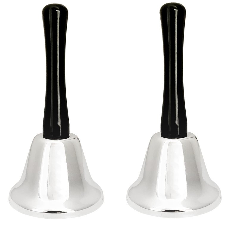 - Product includes 2 pack hand bell, 2.56" diameter, 5.12" height, silver bell, black handle, classic style.